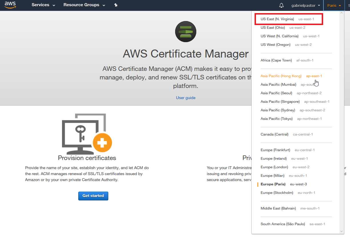 J'ai créé un certificat avec AWS certificate manager. Attention par défaut j'étais positionné dans Amazon sur la région Paris. Il faut impérativement être sur la région N. Virginia quand on crée un certificat, sinon il ne sera pas visible de cloudfront lorsqu'on va créer la distribution cloufront.