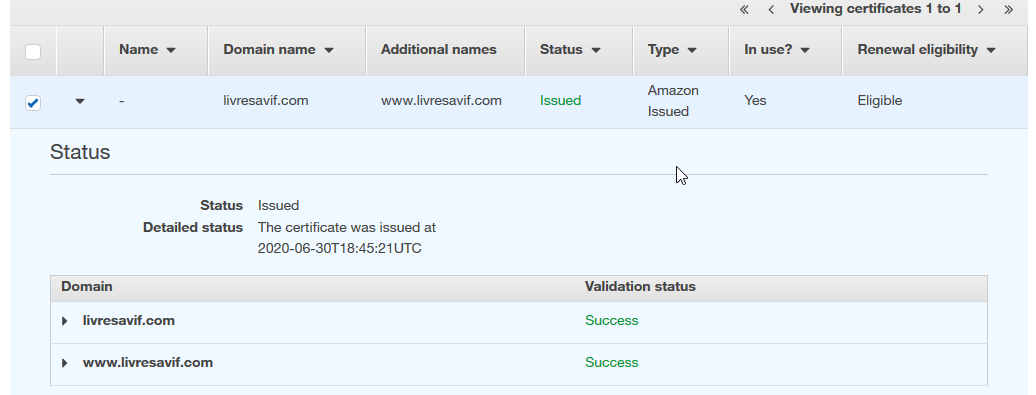 Il faut attendre quelques minutes que le certificat passe en statut Issued